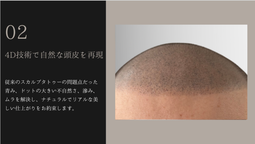 スカルプインクは、麻酔を使用せず痛みも少ない頭皮タトゥー技法です。 唯一無二のスライディングテクニック、4Dテクニックはリアルで とても自然な頭皮を再現できます。スカルプインクオリジナルの特殊な インクを使用して毛根と同じサイズの美しいドットを描いていきます。 (回数や時間は範囲や皮膚の状態で個人差がございます。) ダウンタイムもなく、当日からシャンプーも出来ます。 地肌の透け感をカバーし、薄毛のお悩みを解決するだけでなく、 フェイスラインにグラデーションを入れることで視覚的な小顔効果 を手に入れることも可能です。